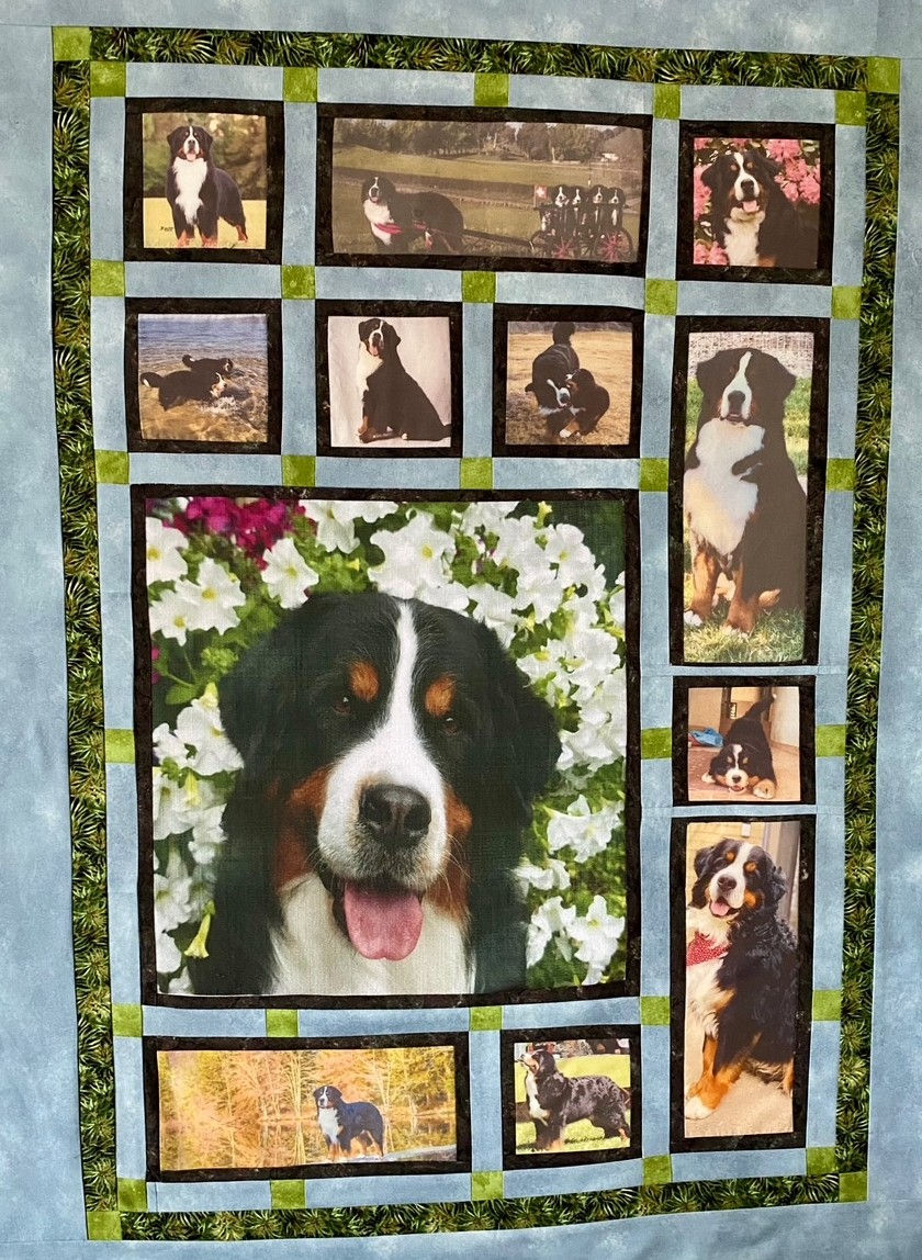 By artist Vicki Martin. Custom made specifically for the 2025 BMDCA National Specialty. This quilt was designed and created by Vicki. She selected the dogs from multiple photos that were submitted to create this unique and beautiful quilt.